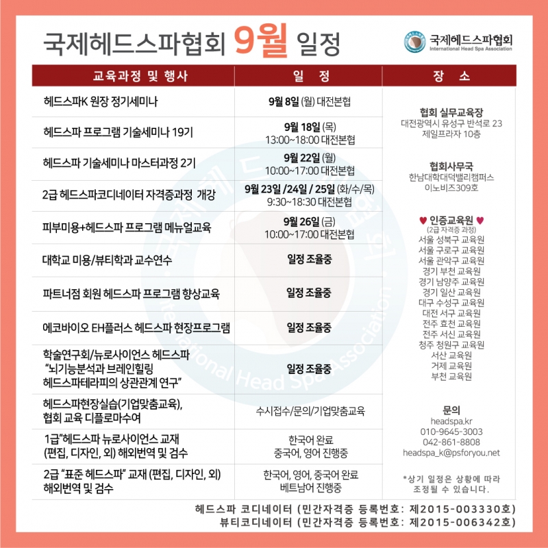[국제헤드스파협회] 2025년 9월 국제 헤드스파협회 일정표