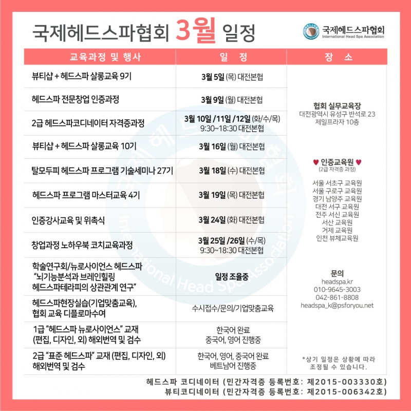 [국제헤드스파협회] 2026년 3월 국제 헤드스파협회 일정표